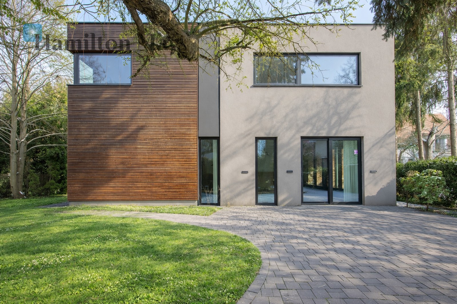 The house, with a usable area of 202 m², is situated on a 530 m² plot, offering a spacious and functional layout ideal for family living. The modern architectural design blends seamlessly with the surrounding villa-style neighborhood, emphasizing the elegant and timeless character of the property.